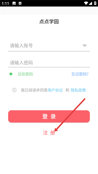 3、在【點(diǎn)點(diǎn)學(xué)園】登錄頁面點(diǎn)擊【注冊】,進(jìn)入注冊頁面。