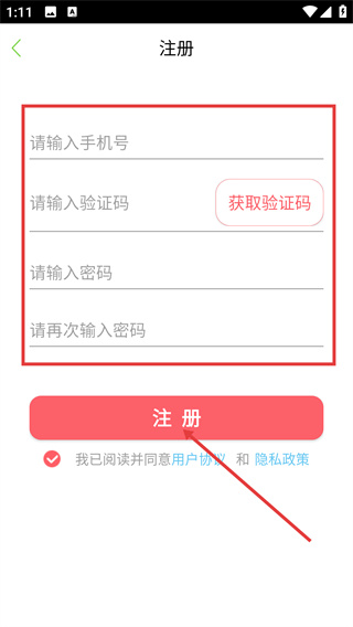 4、在注冊頁面填寫手機(jī)號、驗(yàn)證碼、密碼等信息后,點(diǎn)擊【注冊】,完成注冊流程。