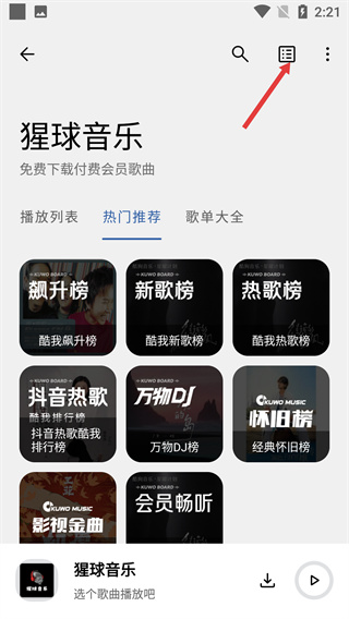 1、進(jìn)入猩球音樂(lè)的【熱門推薦】頁(yè)面,點(diǎn)擊右上角對(duì)應(yīng)按鈕,可彈出【綁定歌單】的操作彈窗。