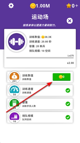 3、進入已解鎖的運動場,可查看訓(xùn)練數(shù)值訓(xùn)練速度等屬性,還能升級這些屬性來提升訓(xùn)練效率,同時訓(xùn)練區(qū)容量限制學(xué)員人數(shù)。