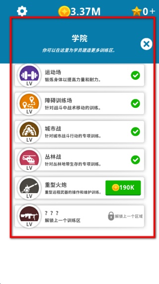 4、進入學(xué)院頁面可查看各類訓(xùn)練區(qū),已解鎖的訓(xùn)練區(qū)能直接使用,未解鎖的訓(xùn)練區(qū)需消耗指定金幣解鎖,解鎖后開啟對應(yīng)專項訓(xùn)練。